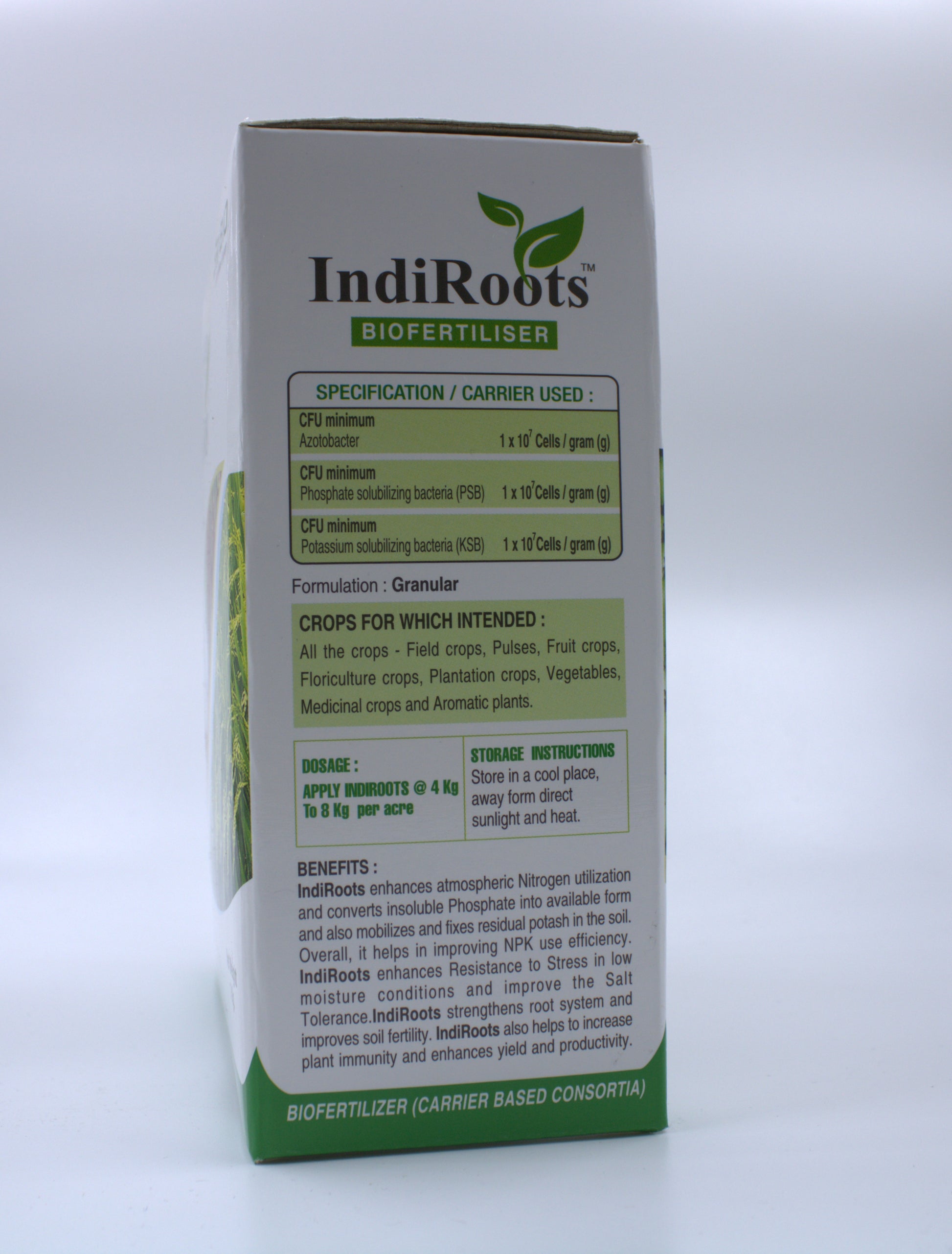 - IndiRoots enhances atmospheric Nitrogen utilization and converts insoluble Phosphate into available form and also mobilizes and fixes residual potash in the soil.