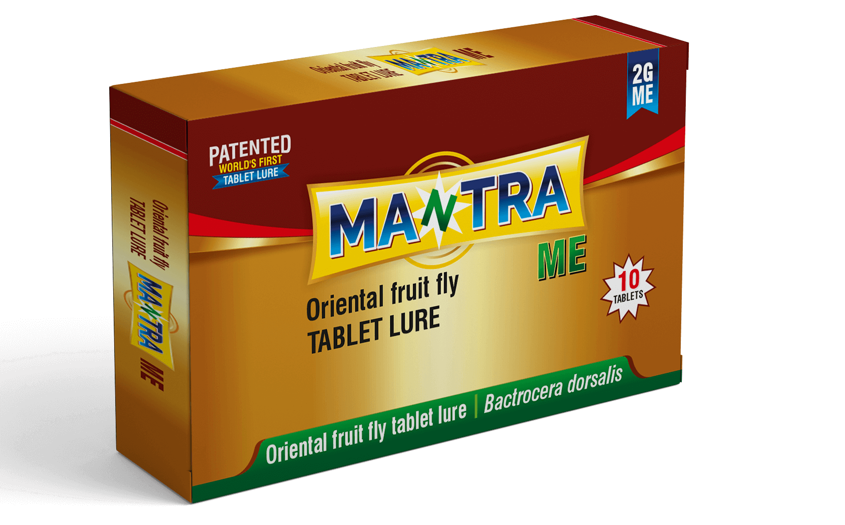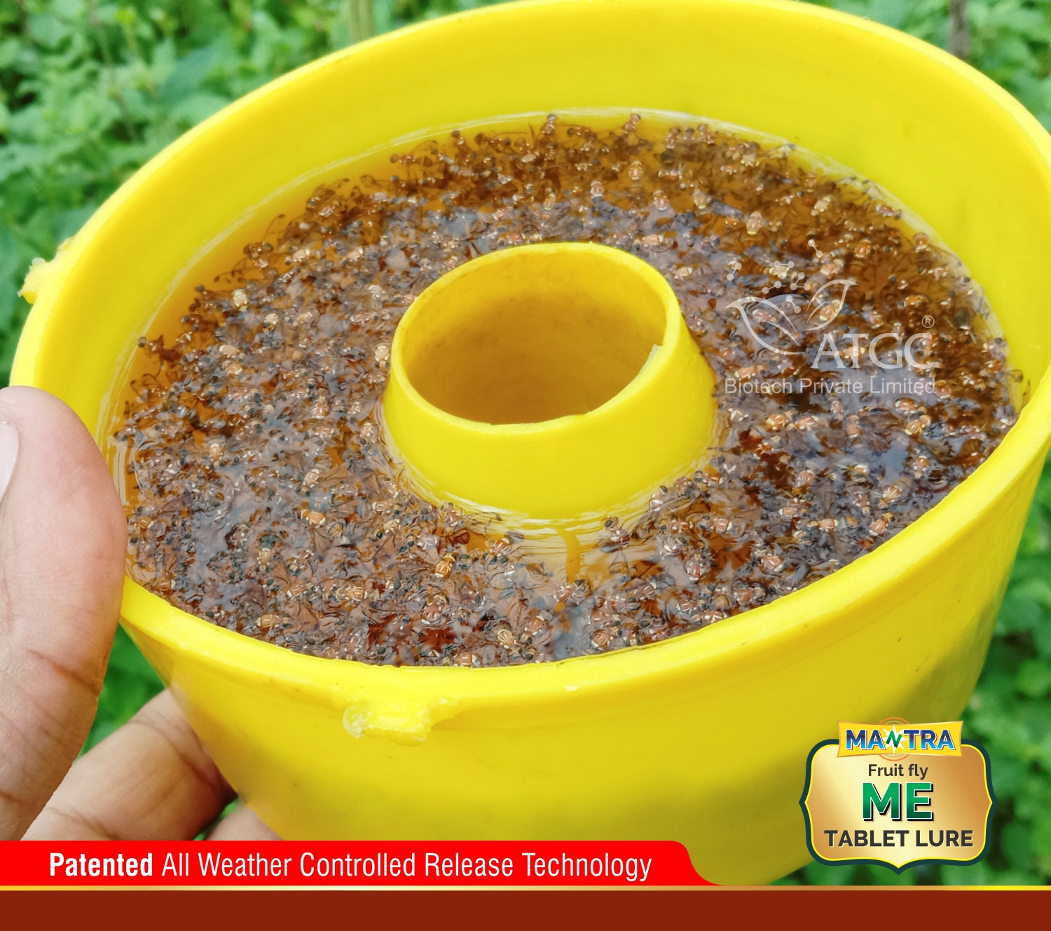 The MANTRA ME lure is an attractant for Fruit fly (B. dorsalis). The MANTRA ME lure installed in McPhail trap can be used for monitoring and mass trapping of B. dorsalis. MANTRA ME lure will release the para-pheromone at a constant rate over a period of 90-120 days. The fruit flies are attracted and fall into the trap installed. By monitoring farmer can decide his pesticide spray schedule for B. dorsalis and through mass trapping the pest intensity will be reduced by trapping a part of pest population. Application